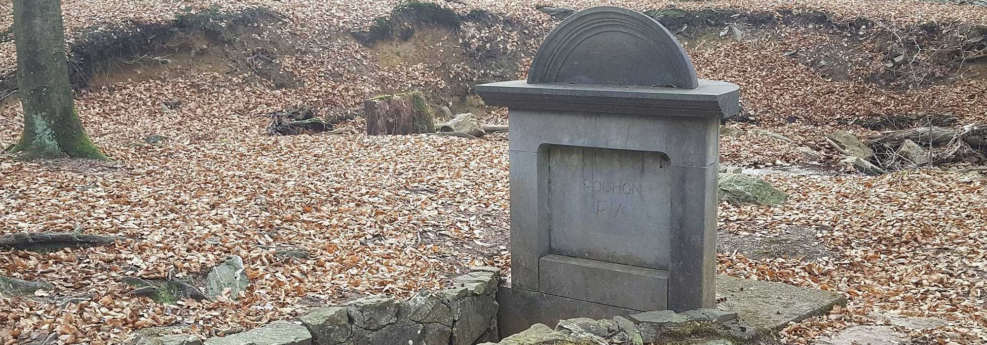 De constructie rond de bron bestaat uit een stenen kolom, die halfrond aan de achterzijde is en aan de voorkant grotendeels vlak. In een verdieping in deze stenen kolom staat de inscriptie Pouhon Pia. Aan de voorzijde van deze stenen kolom bevindt zich een rechthoekige verlaging die ommuurd is met blokken natuursteen. Aan het uiteinde bevindt er zich een trapje van blokken natuursteen. In de verlaging komt er uit de voet van de stenen kolom een pijpje waaruit het bronwater stroomt en in het plasje water borrelt het water ook uit de ondergrond op.
