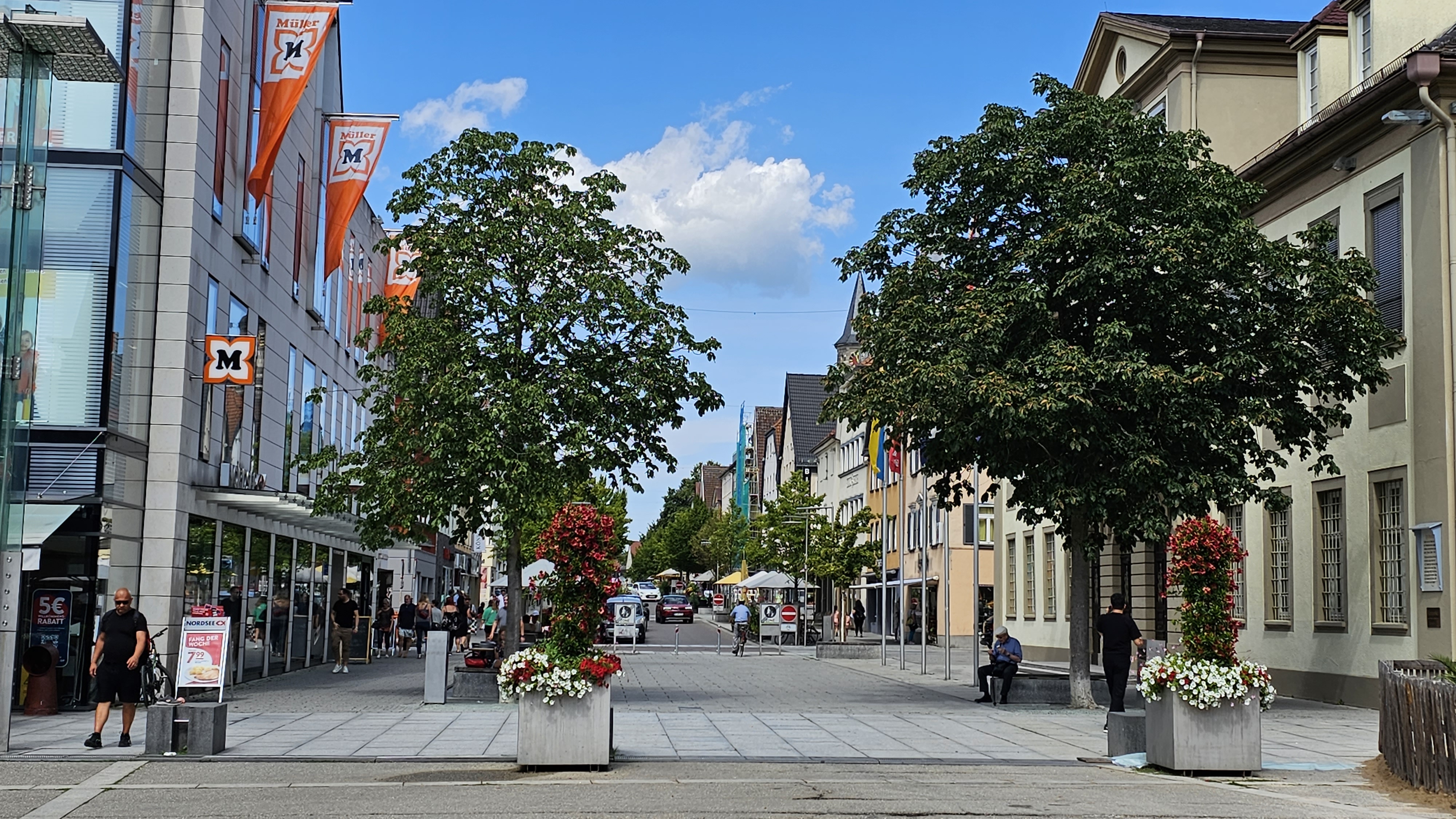 We starten onder een stralende zon met volle goede moed aan het treinstation van Göppingen. Het begin van onze tocht loopt dwars door het verkeersvrije stadscentrum.