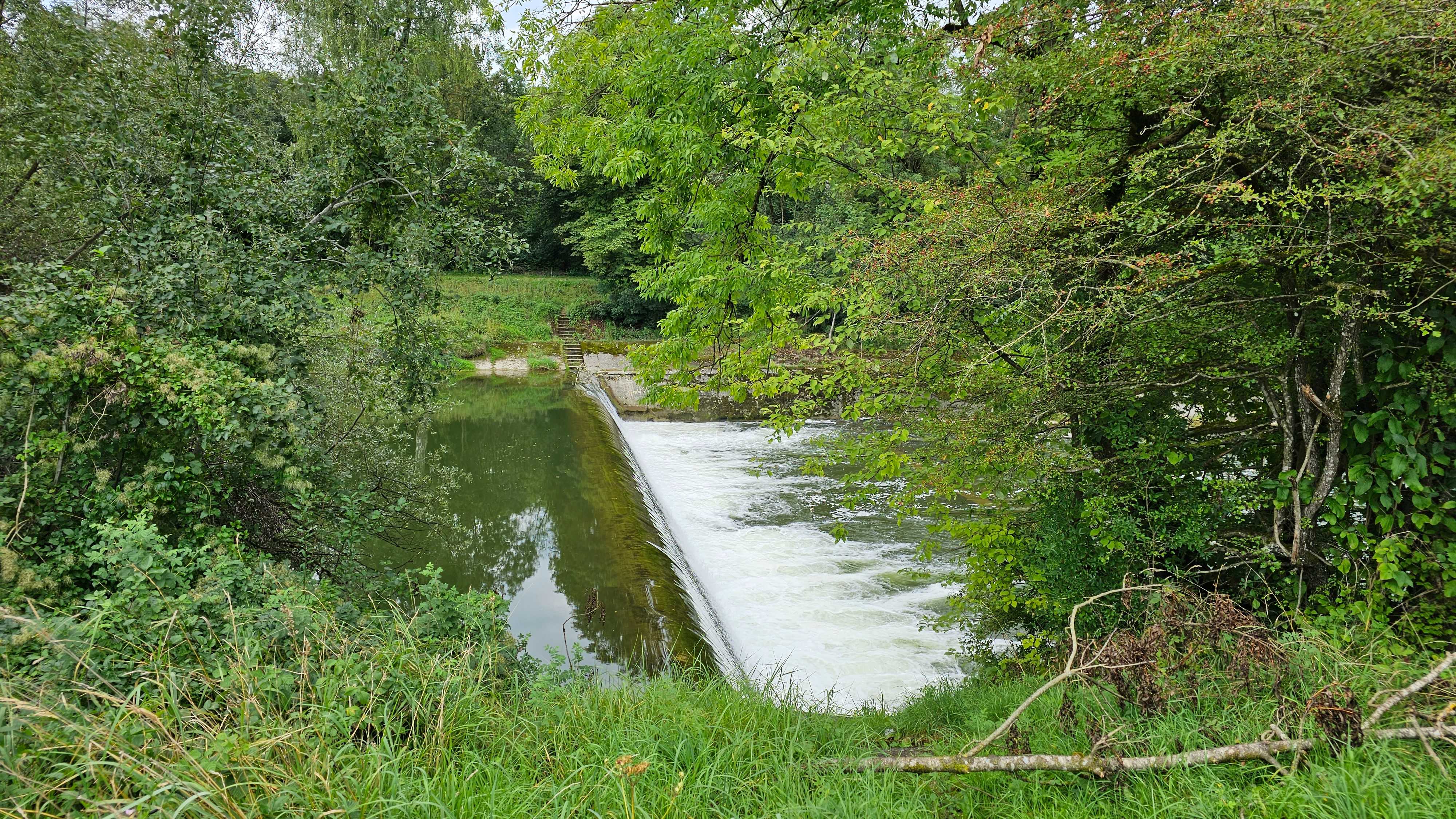 Ongeveer in het midden van deze tocht steken we de Iller over aan een dam. We worden er verwelkomd door een kleine doch enthousiaste hond. Hij springt van vreugde als hij ons ziet.