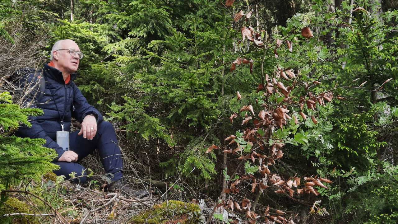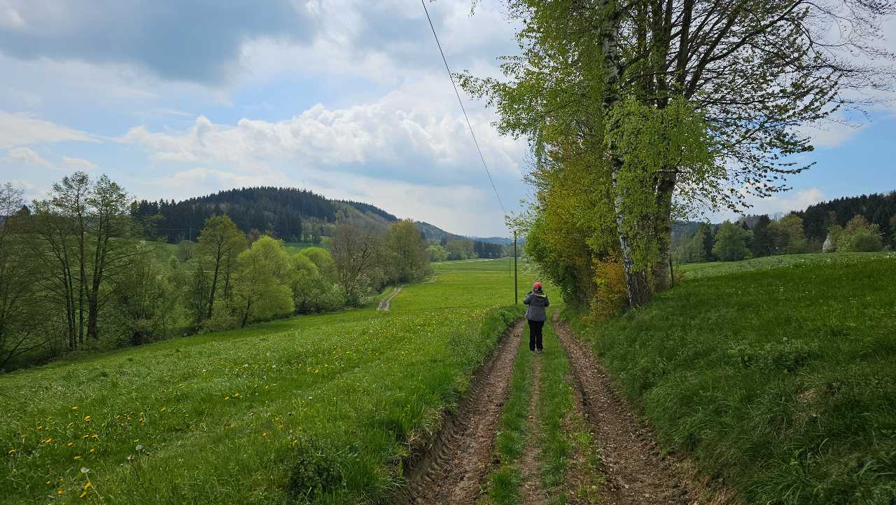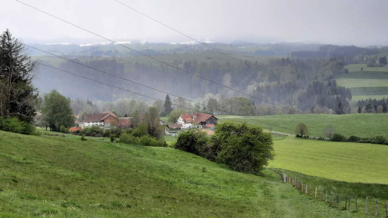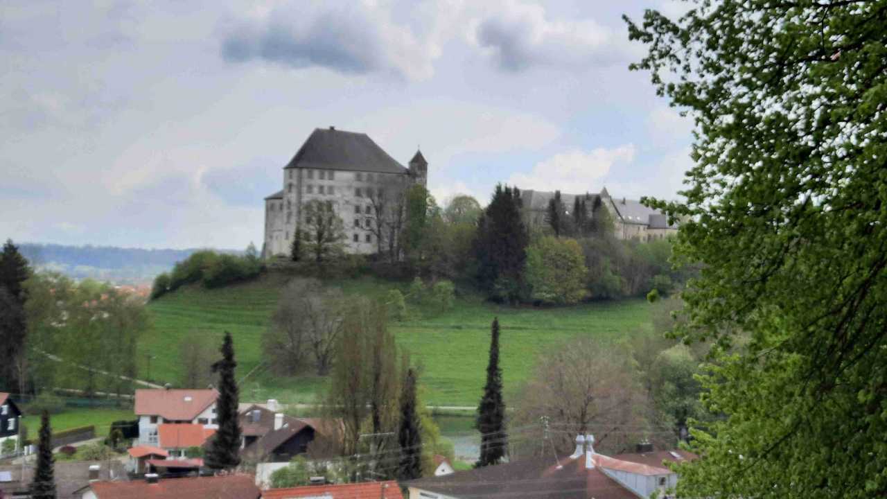 Na een korte wandeling doorheen het dorp en langs een kabbelende beek, lopen we voor de eerste maal tussen grasvlaktes die bezaaid zijn met boterbloemen. Daarna trekken we langs een bos waar we een mooi uitzicht hebben op het kasteel van Bad Grönenbach.