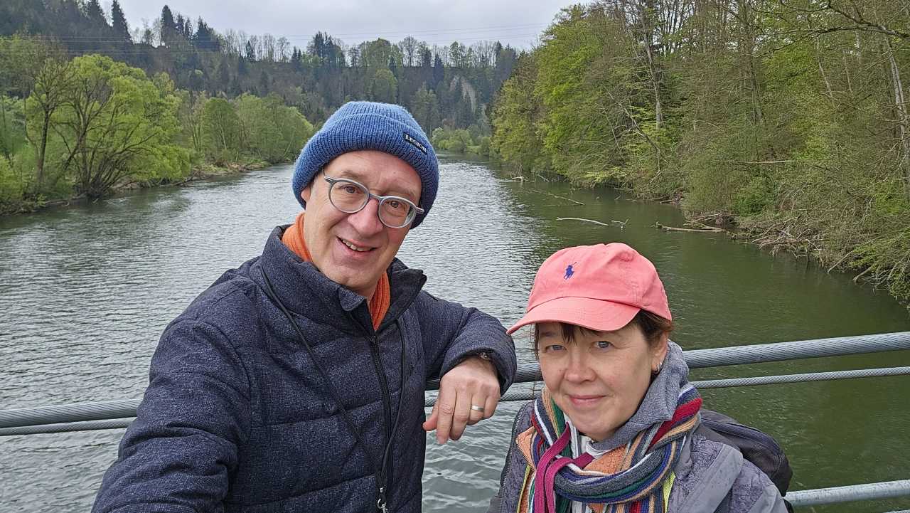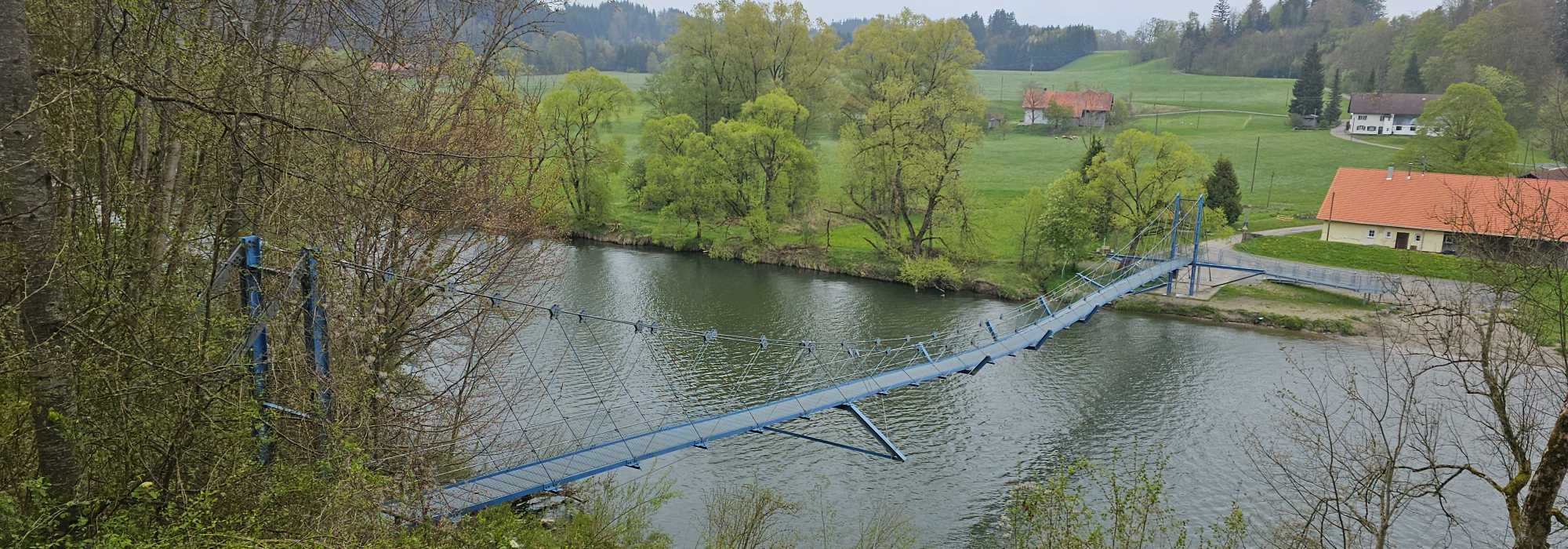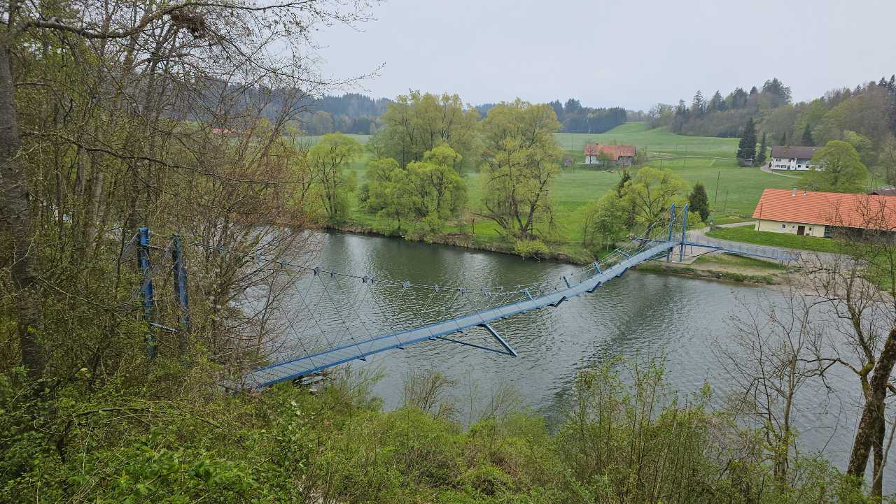 Daarna volgt een tocht de hoogte in langs uitgestrekte weidevelden via het gehucht Mannenberg, Maierhof naar Pfosen alwaar we de rivier de Iller oversteken via een hangbrug. Deze brug vormt een grote mijlpaal tijdens onze tocht, want het is ons 1.000-kilometerpunt.