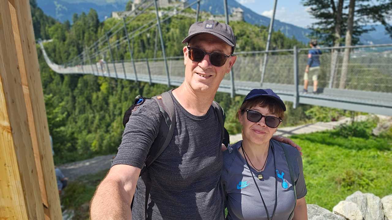 Na de eerste kilometers gewandeld te hebben komen we aan bij de de bekende hangende brug "Hikeline 179". Deze brug is ca 400 meter lang en verbindt op een hoogte van ongeveer 100 meter boven het dal te heuvels en ook twee verschillende ruïnes van burchten.