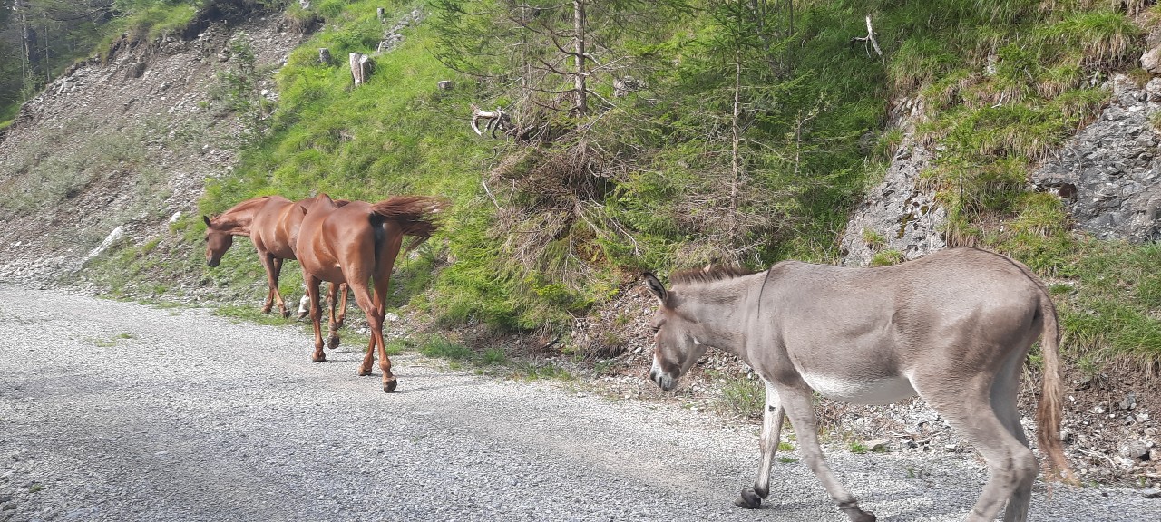Even verder passeert er ons een kudde van een zevental loslopende paarden. Blijkbaar zijn ze de wandelaars gewoon want ze passeren zonder veel aan ons te schenken.