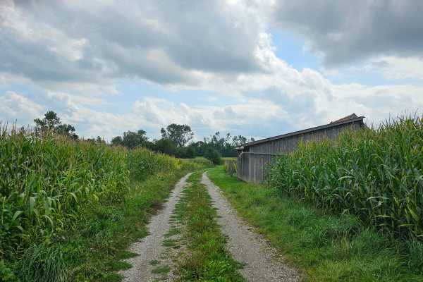 We stappen doorheen landbouwgebied en wandelen langs een gedeelte van de...