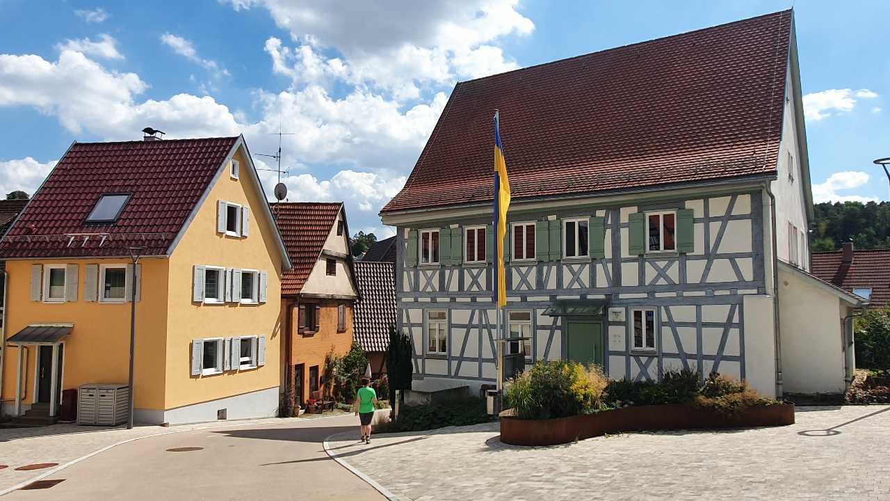 Daarna loopt de weg doorheen een landbouwlandschap, langs een bos naar het dor Weissach. We houden halt bij een fontein en geloof me: op een warme dag je hoofd onderdompelen in een koele fontein is heerlijk en doet wonderen. Ilona past hiervoor.