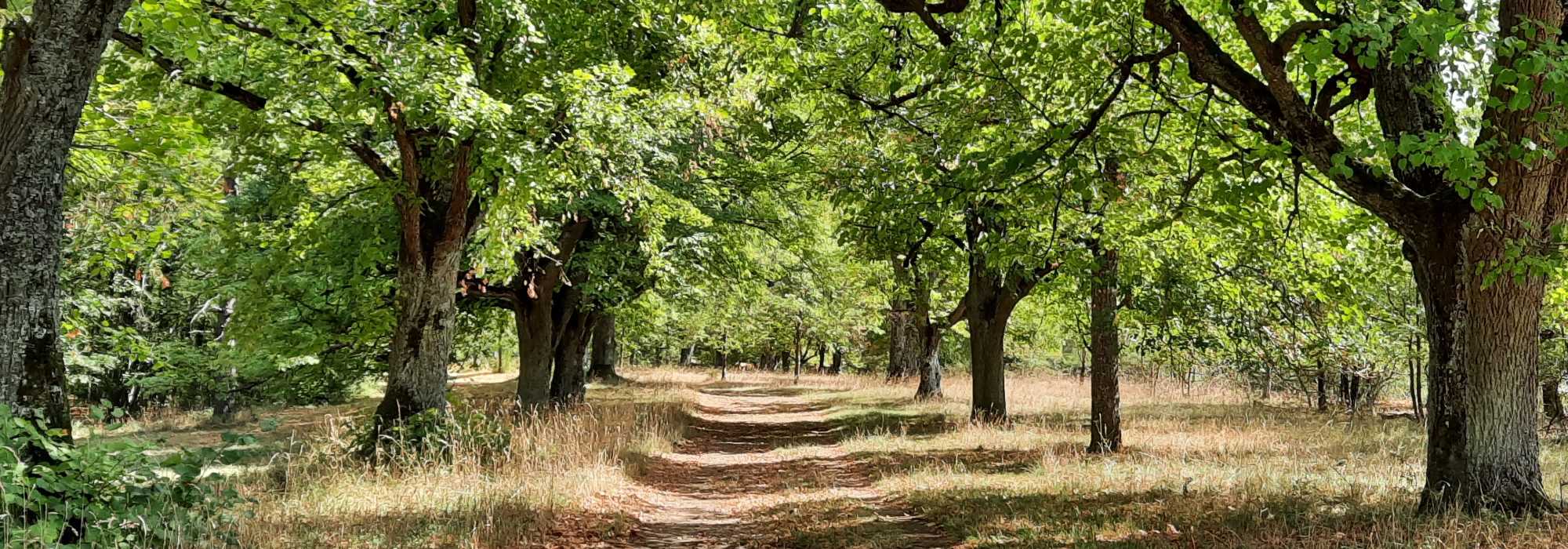 De weg loopt meteen opwaarts de heuvel op. Onze inspanningen worden echter beloond met een prachtige laan, omzoomd met grote bomen die over de heuvelrug loopt.