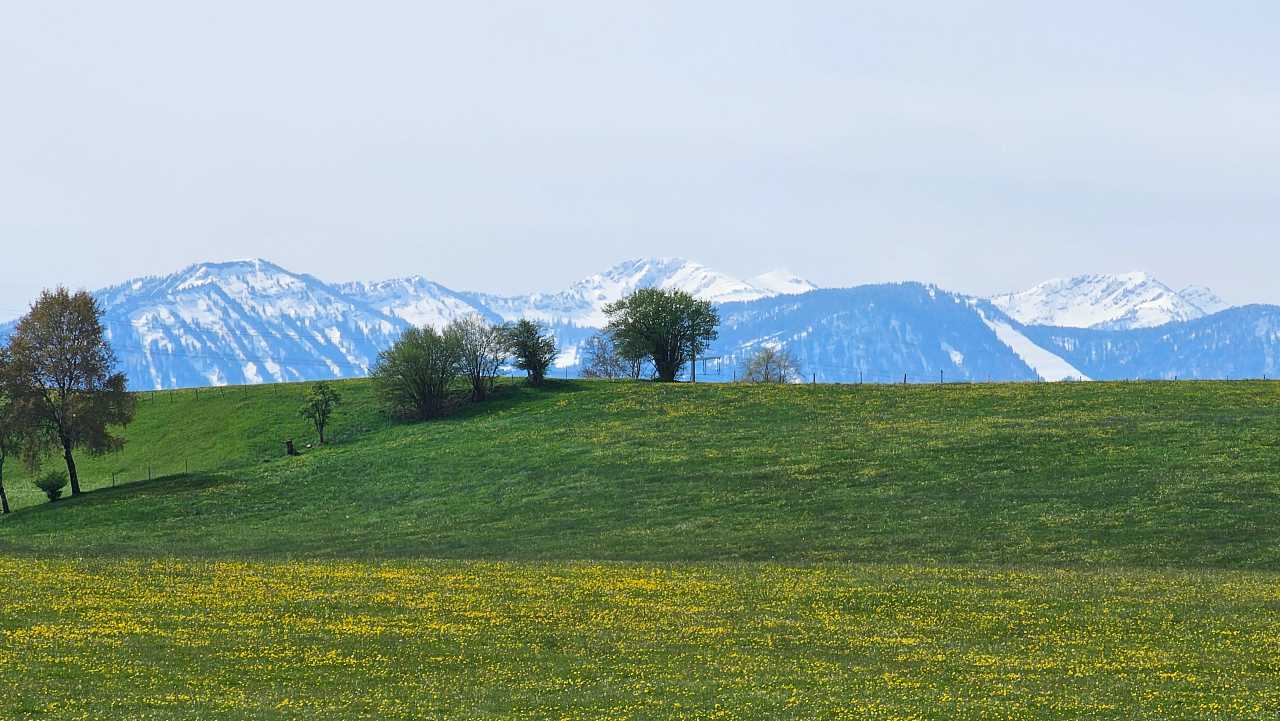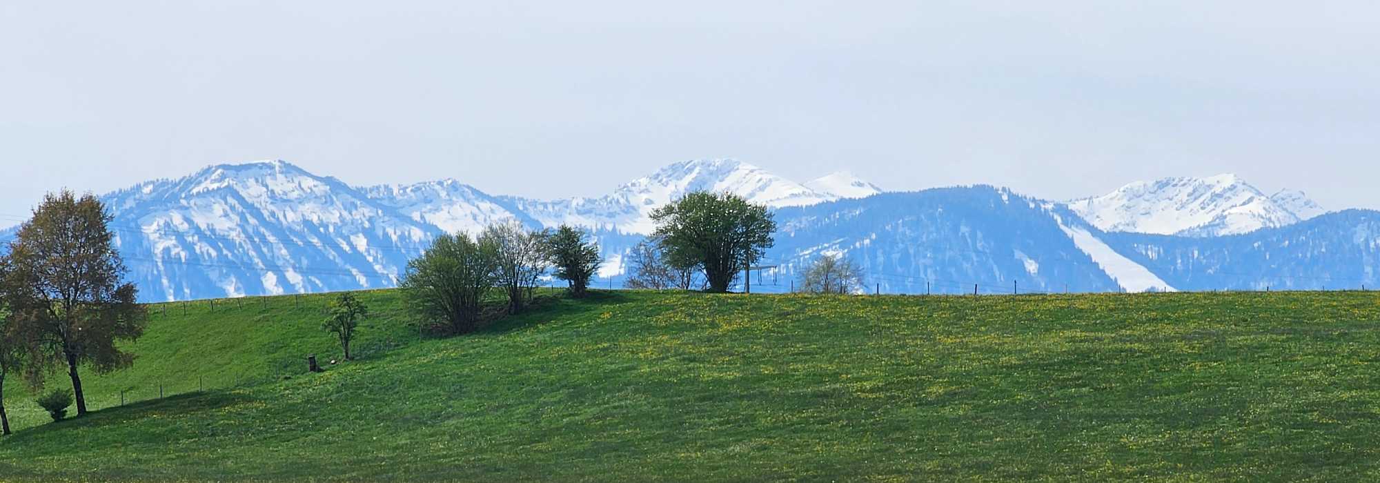 Eens het park voorbij gaat het omhoog naar het gehucht 'Roslink' en daar hebben wij eindelijk onze eerste blik op 'de Alpen'. Plots uit het niets doemen ze aan de einder op!! Ze zijn natuurlijk nog ver, maar voor het eerst in onze 1.000-km lange tocht kunnen we zien waar we al geruime tijd naar verlangden.