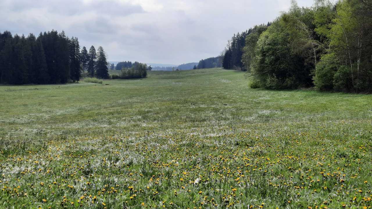 Nadat we het dorp uitwandelen lopen we aan de rand van het bos in langsuitgestrekte weidevelden, volledig bezaaid met boterbloemen.