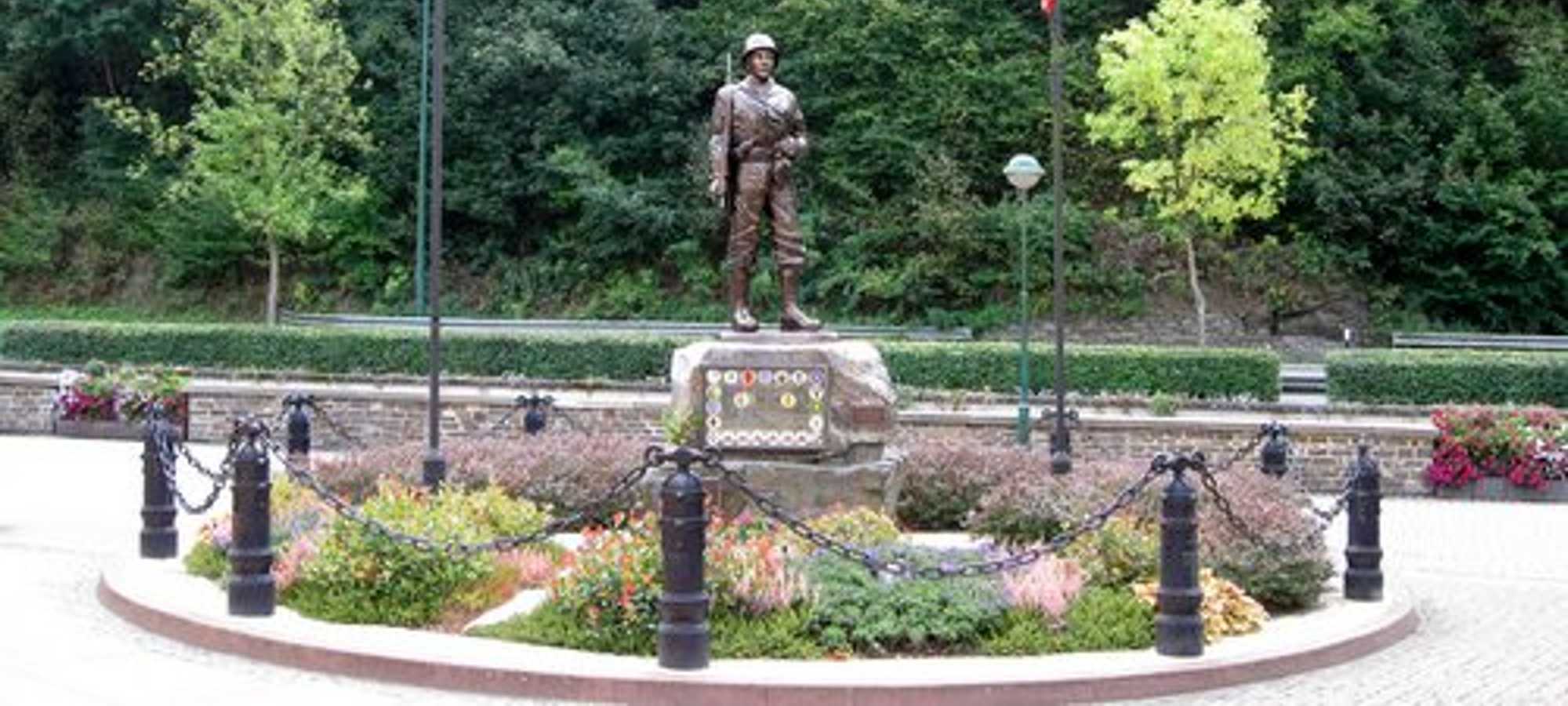 Op het voetstuk in het midden is een glazen plaat aangebracht met een rand korpsemblemen van de geallieerden die in Clervaux zijn geweest.