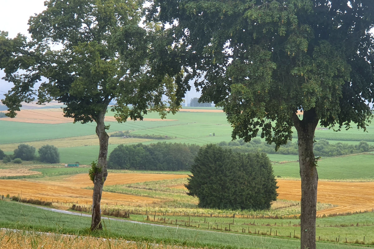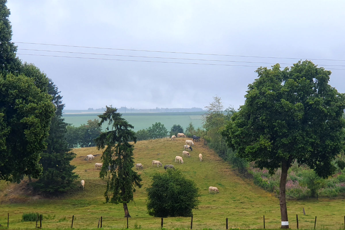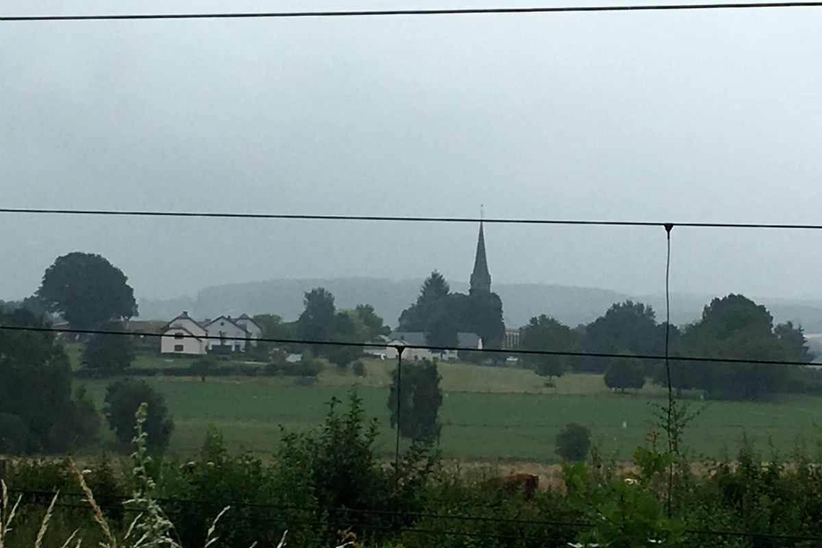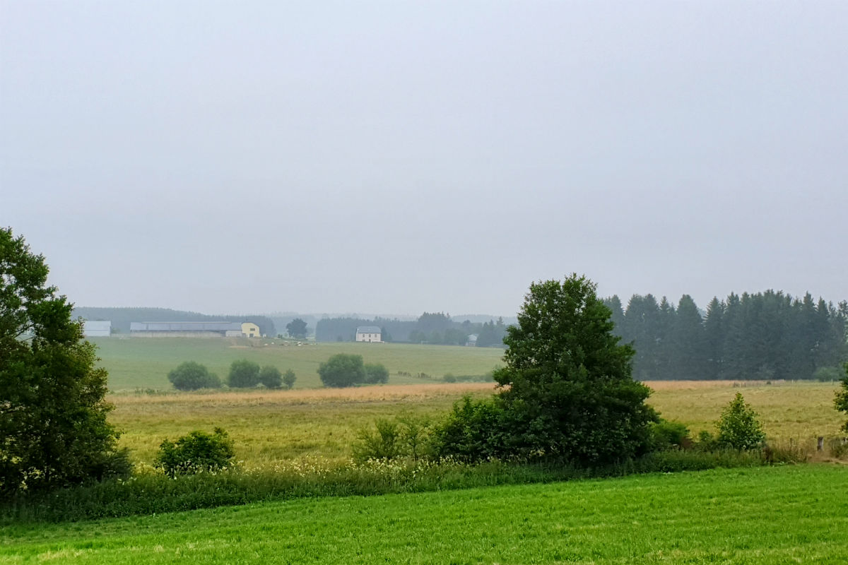 Een tijdje zullen wij nog flirten met deze grens want deze scheidingslijn ligt pal langs ons pad. Na een paar honderd meter verlaten wij definitief België en duiken wij de Luxemburgse heuvels en velden binnen. Het uitzichten over het landschap en dorpen is er zeer mooi. Enkel het weer valt niet echt mee want wij krijgen geregeld een regenbui over ons heen. De ene wat intenser dan de andere maar ach, de temperatuur valt mee en wij drogen dan ook rap.