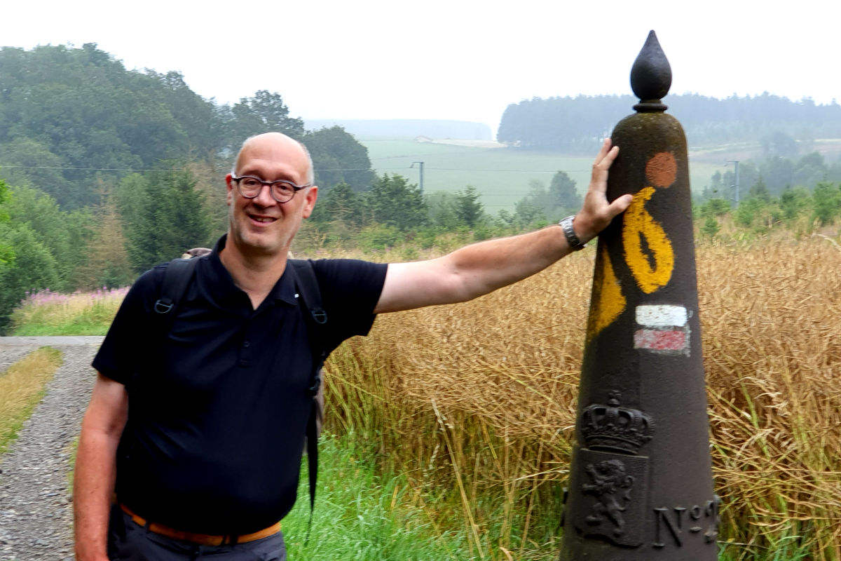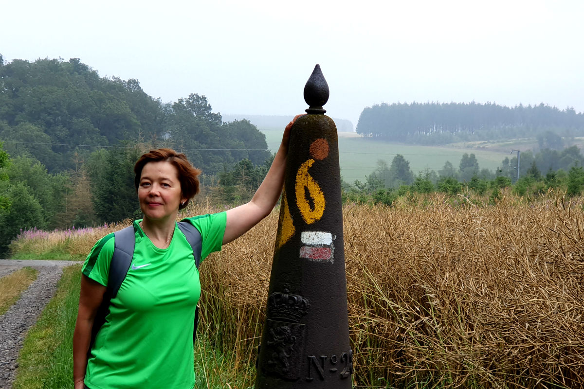 Na een korte tocht door de laatste paar kilometers in België die ons rest komen we aan de grens met het Groot-Hertogdom Luxemburg. De grenspaal met nummer 281, geplaatst in het jaar 1843 markeert deze grens duidelijk. Het is nu officieel!! We hebben gans België doorgewandeld. Deze tocht ving aan op 31 juli 2017 en daarbij wandelden wij van ons huis te Sint-Kruis/Brugge over Gent, Brussel, Leuven, Tienen, Luik, Spa, Vielsalm naar dit grensgebied. We er ontdekten mooie streken, dorpen en steden. Ik schat dat wij in deze periode ongeveer 345 km afgelegd hebben. Al die tijd waren wij twee samen onderweg...