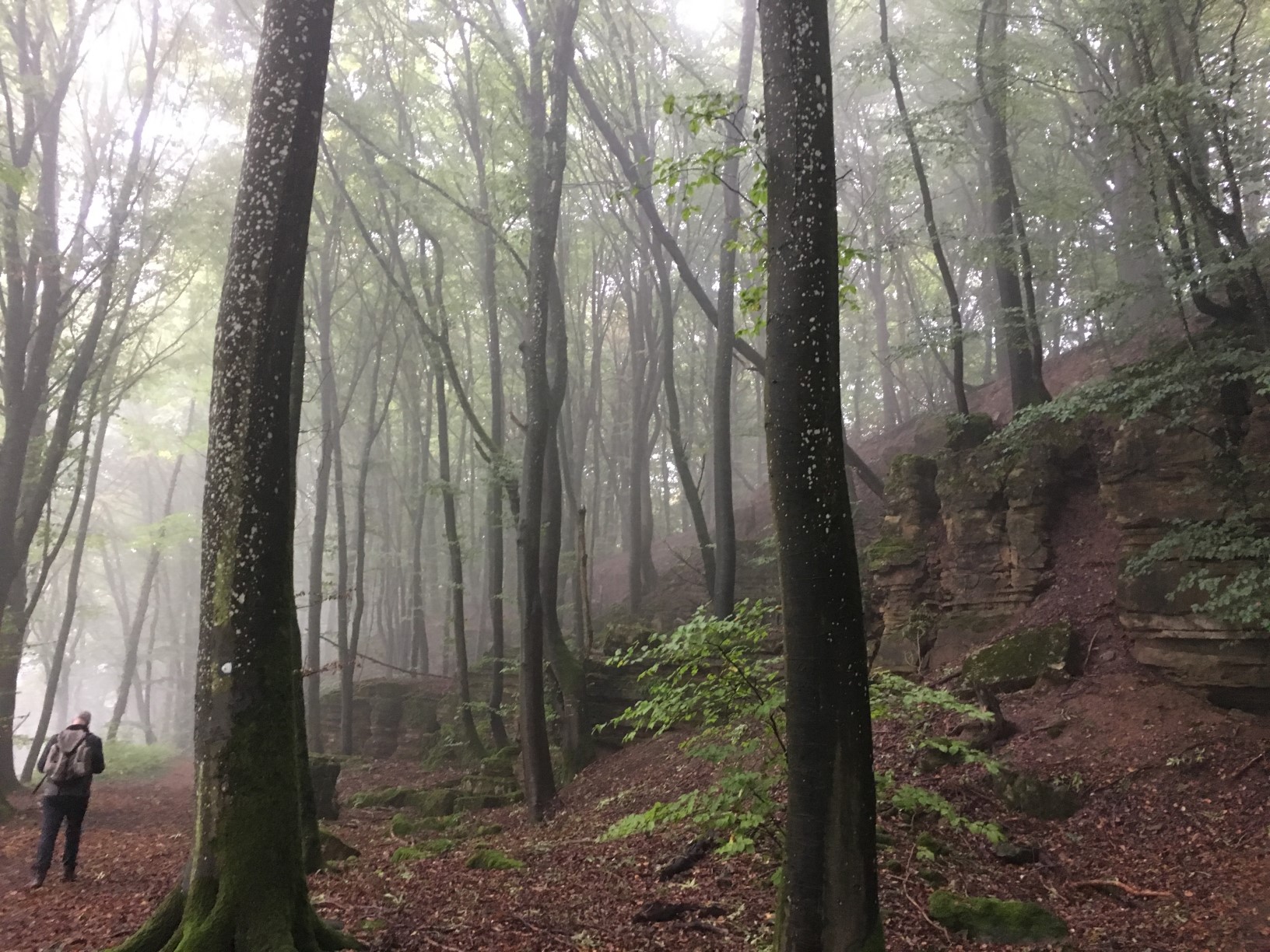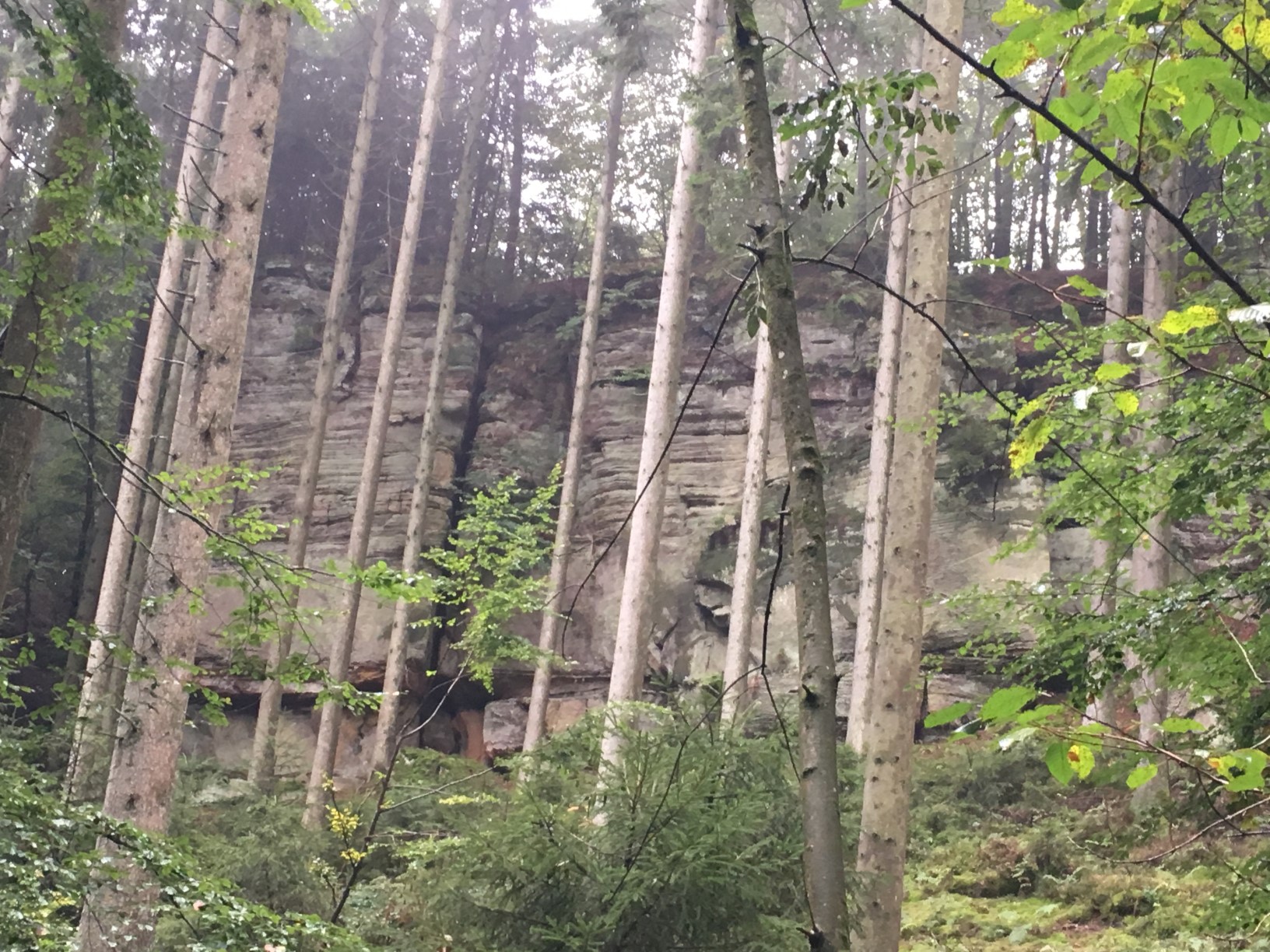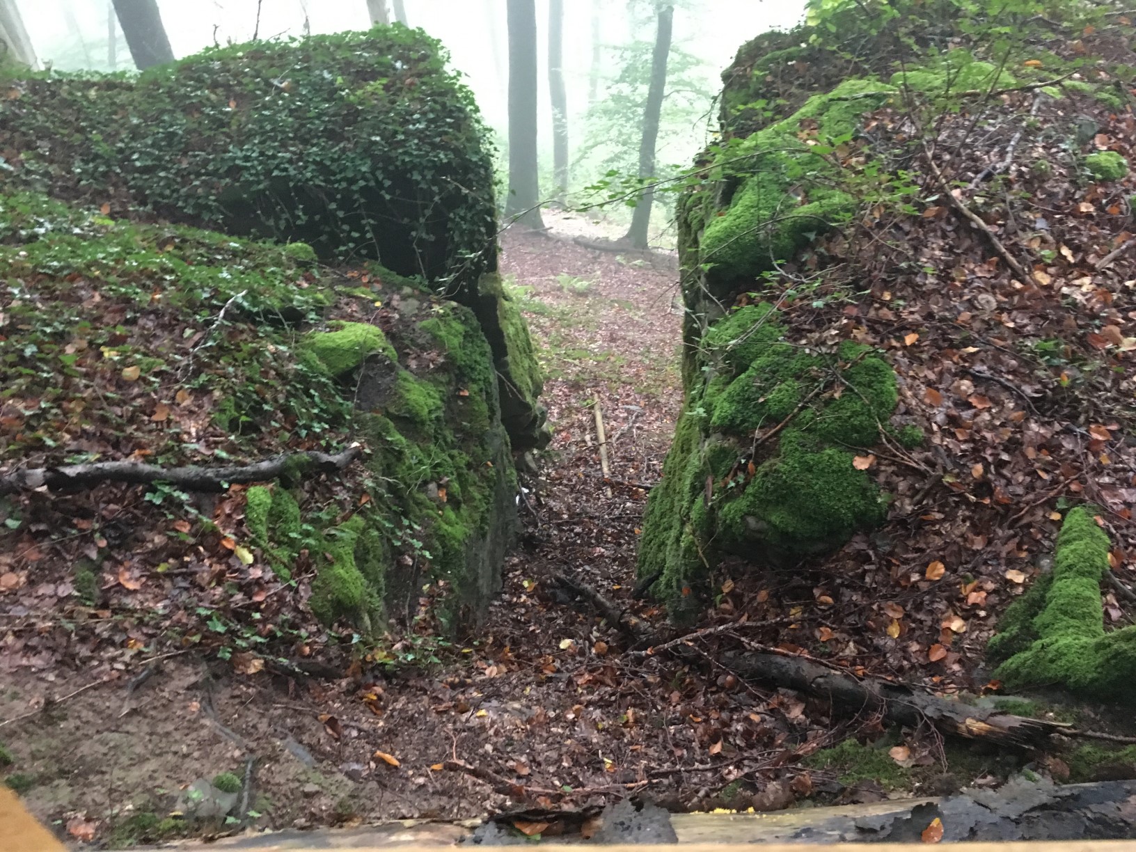 Eens Eppeldorf voorbij dienen we volgens de kaart een pad te bewandelen die ons terug naar een stuk bos leidt. Helaas... een boer heeft deze weg onlangs ingepalmd waardoor we een paar keer onder een electrische en stekkerdraad heen moeten, maar ook dit opstakel vormt voor ons geen probleem. De daaropvolgende klim langs een oud en waarschijnlijk geschrapte pad was zeer stijl waardoor we na een tiental minuten hijgend de top bereiken, maar de beloning is groot want langzaamaan gaan we een gebied binnen dat "Klein Zwitserland" genoemd wordt. Een mooi pad tussen de rotsen en bezaaid met rode paddestoellen leidt ons naar het kasteel van Beaufort en onze eindbestemming.