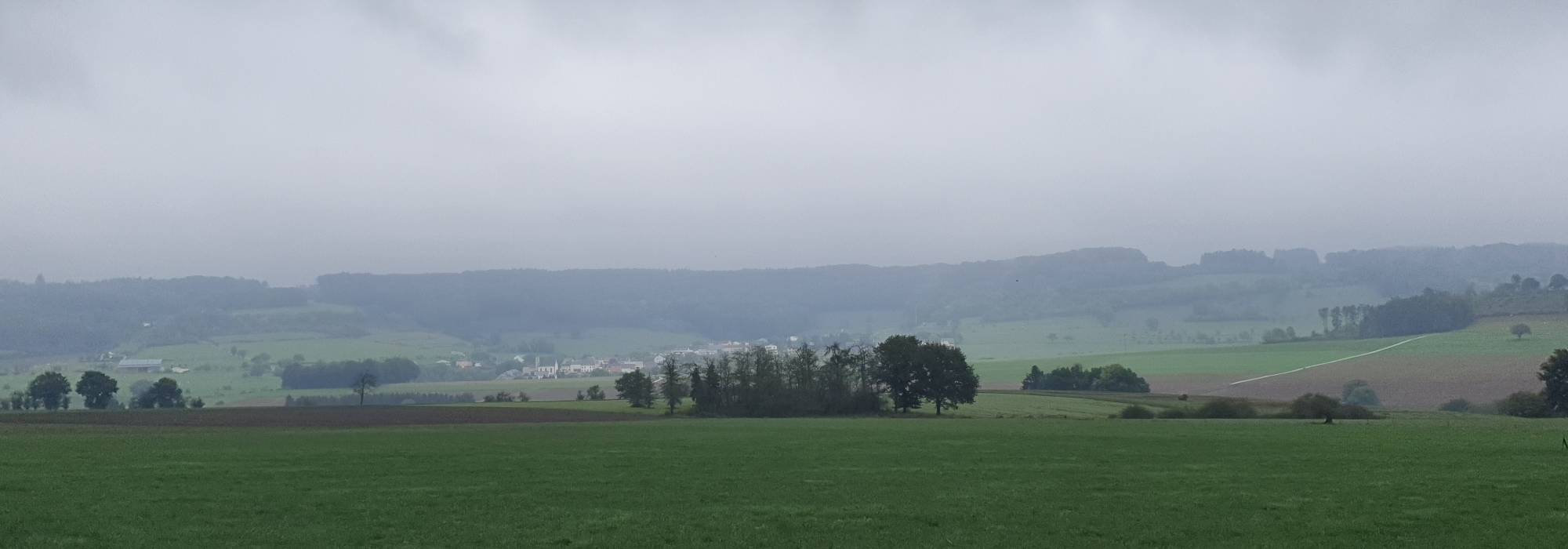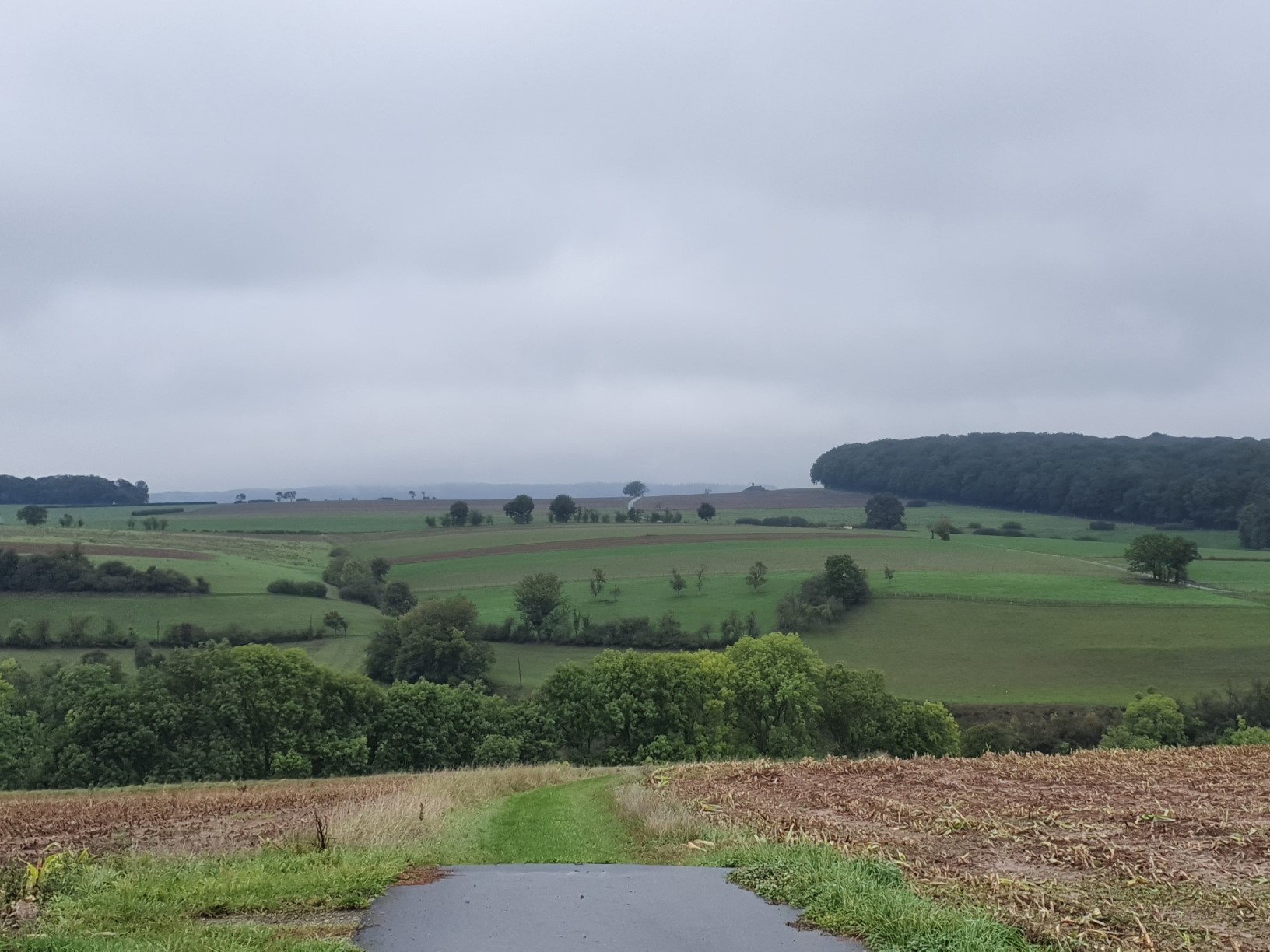 We komen uit in de open velden met in de verte het schilderachtige Eppeldorf. Vooraleer we het dorp bereiken wacht ons een lange en grote afdaling, gevolgd door een ... sterke klim...
