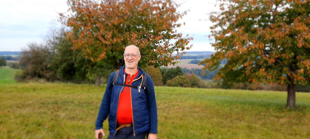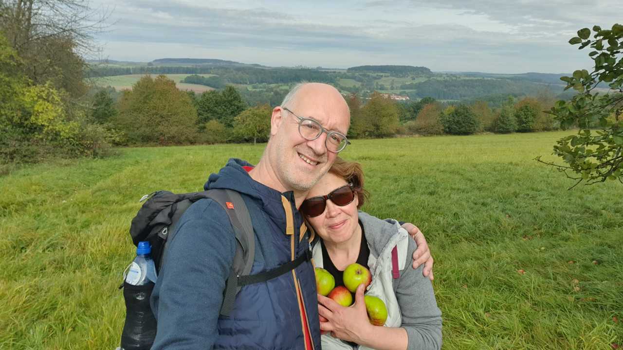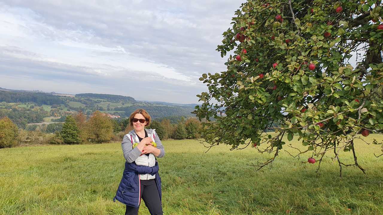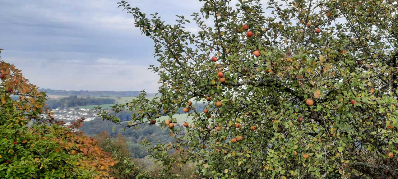 De laatste etappe van het jaar 2021 begint in het dorp Rieschweiler. Wanneer we door dit dorp wandelen merken we er meteen diverse foto's van oude dorpsgezichten aan de gevel. Dit roept een warme, nostalgische sfeer op. Daarna gaat onze tocht recht omhoog naar een heuvelrug met een boomgaard een een prachtig uitzicht over de streek. We kunnen het niet laten om een paar appels te plukken en mee te nemen als herinnering aan dit adembenemend landschap.