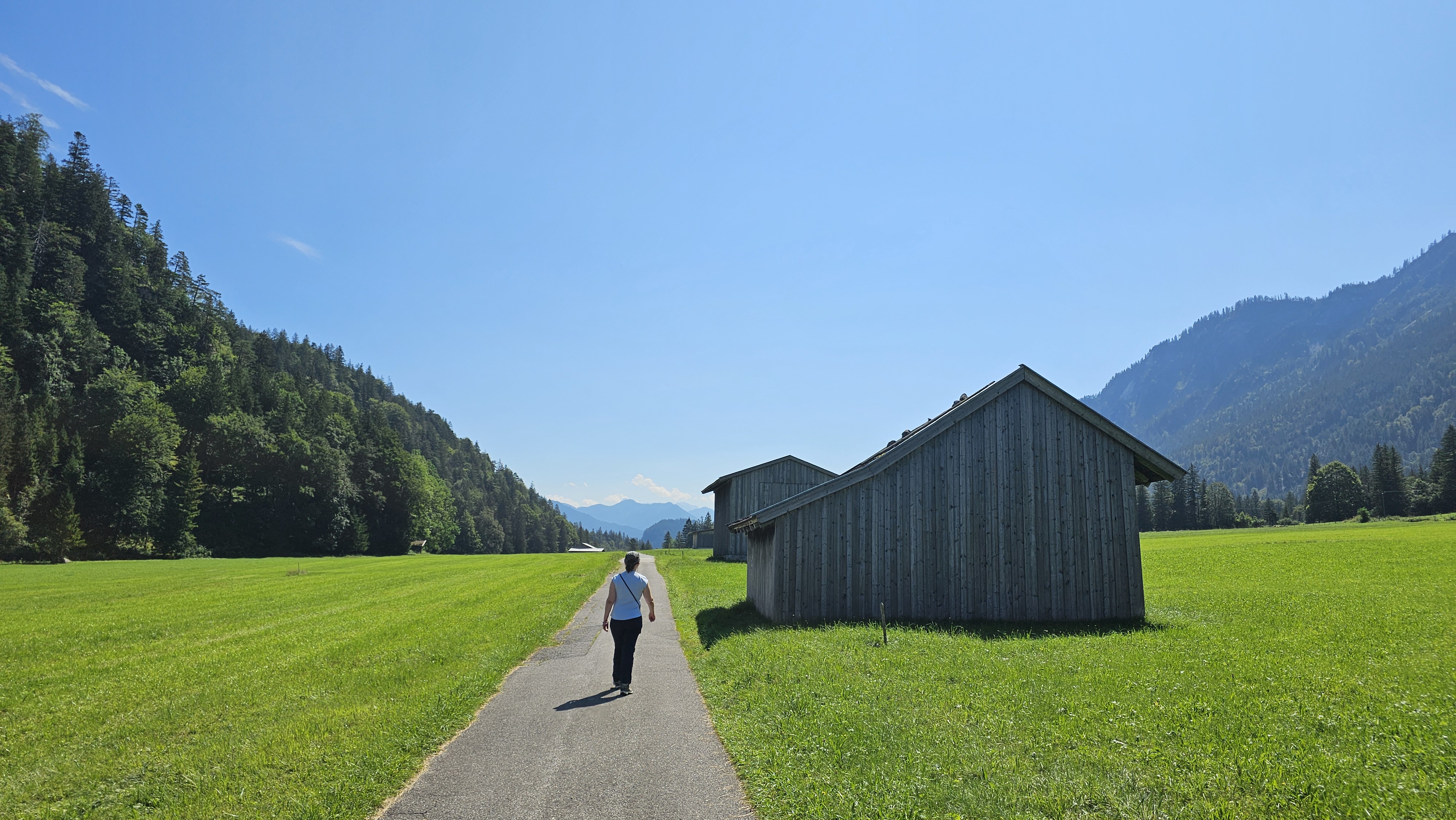 De eerste etappe is relatief gemakkelijk: eentje om het gewoon te worden. We vertrekken in het dorp Vils en door het dal van de Lech naar Reutte. Onze route loopt door een zeer mooi weidelandschap, bezaaid met gele bloemen.