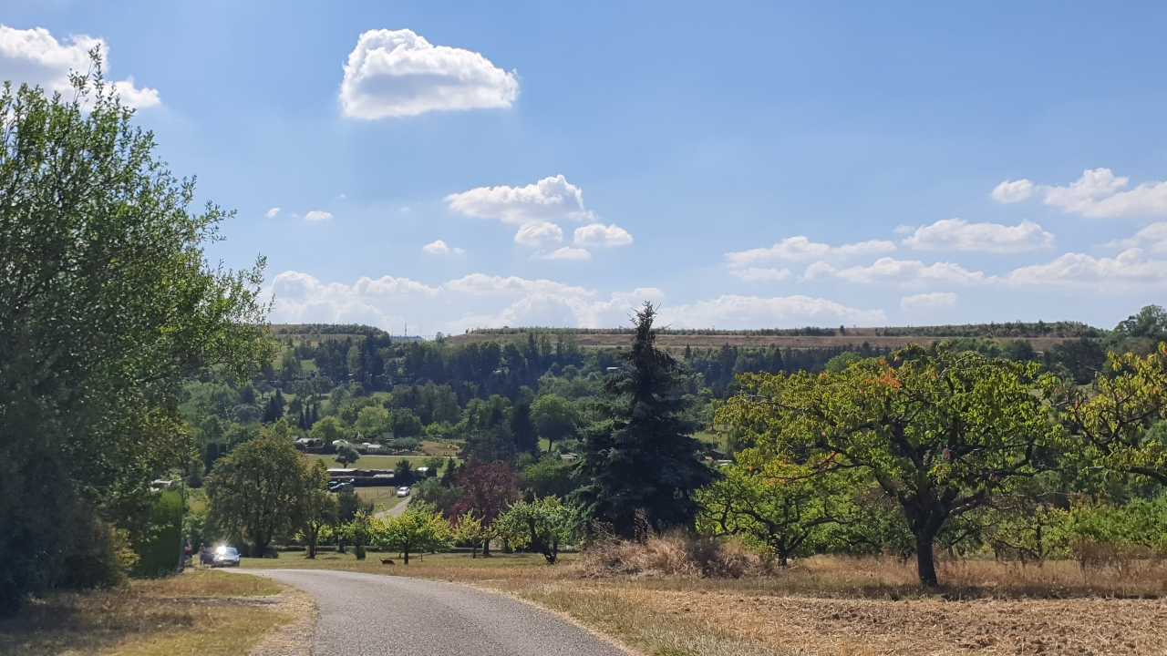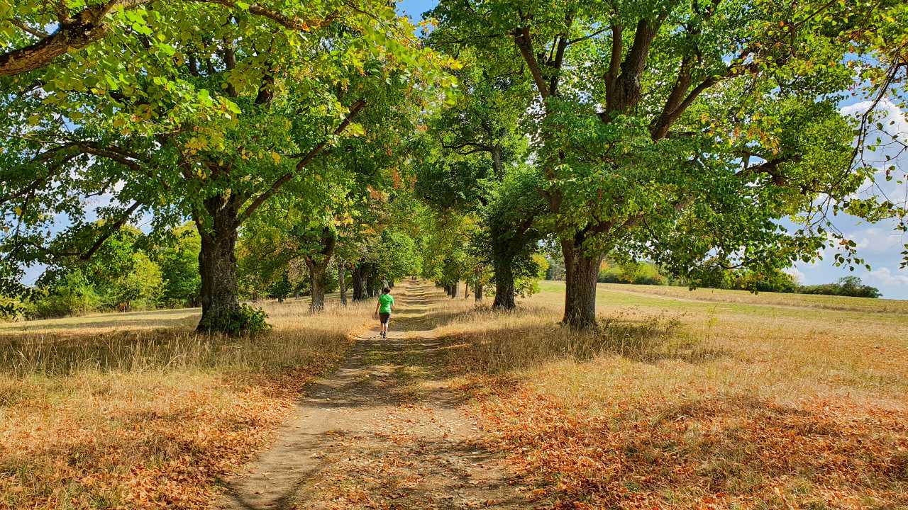 De weg loopt meteen opwaarts de heuvel op. Onze inspanningen worden echter beloond met een prachtige laan, omzoomd met grote bomen die over de heuvelrug loopt.