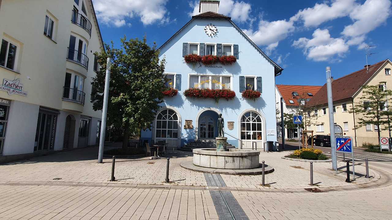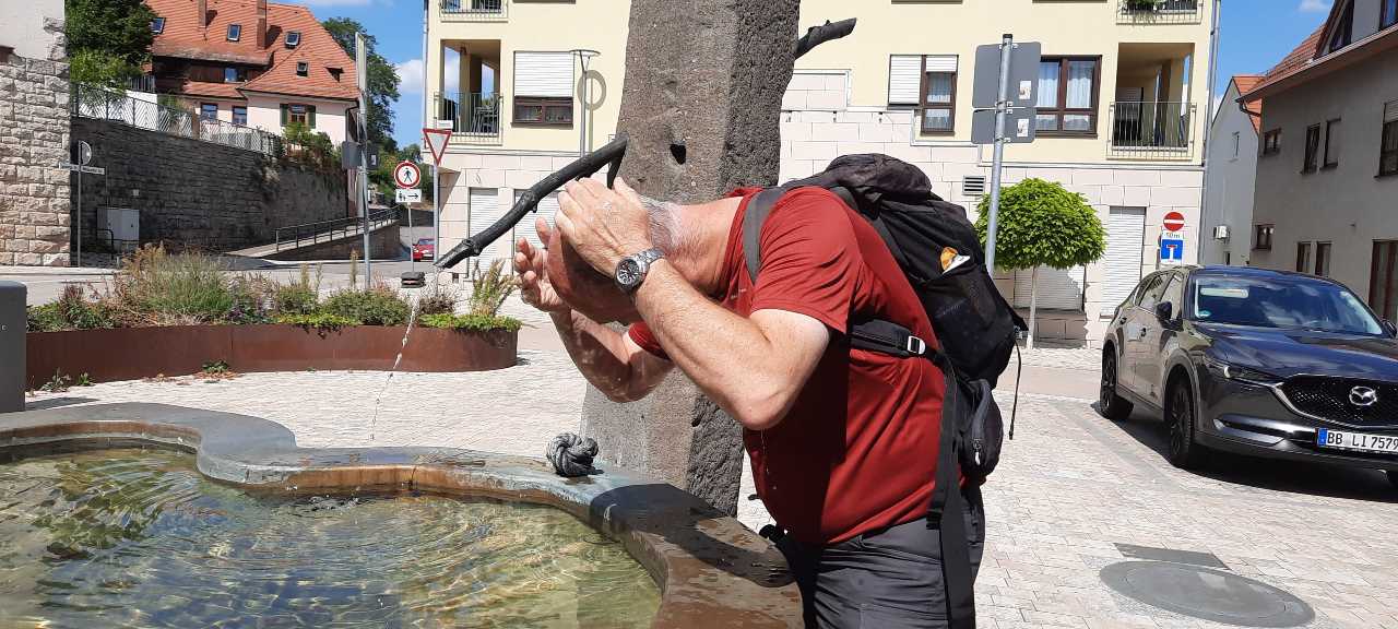 Daarna loopt de weg doorheen een landbouwlandschap, langs een bos naar het dor Weissach. We houden halt bij een fontein en geloof me: op een warme dag je hoofd onderdompelen in een koele fontein is heerlijk en doet wonderen. Ilona past hiervoor.
