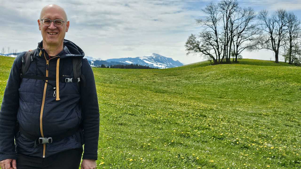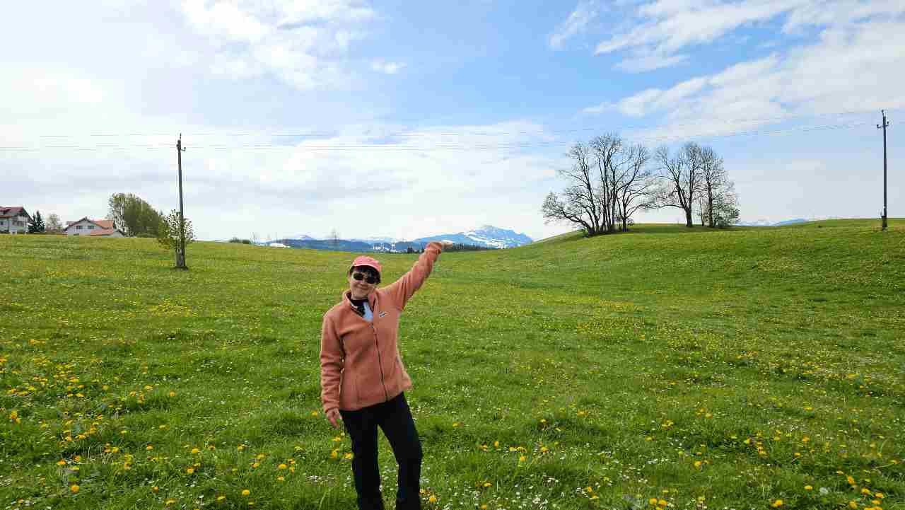 Eens het park voorbij gaat het omhoog naar het gehucht 'Roslink' en daar hebben wij eindelijk onze eerste blik op 'de Alpen'. Plots uit het niets doemen ze aan de einder op!! Ze zijn natuurlijk nog ver, maar voor het eerst in onze 1.000-km lange tocht kunnen we zien waar we al geruime tijd naar verlangden.